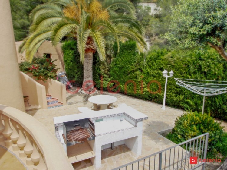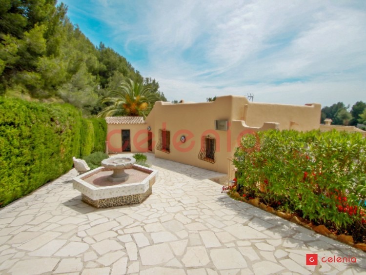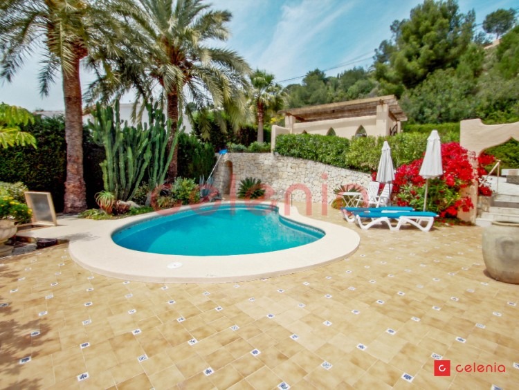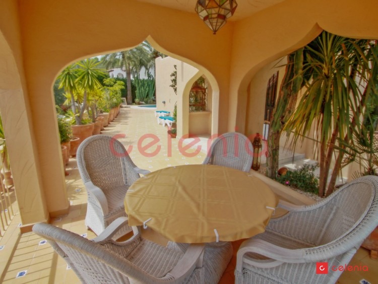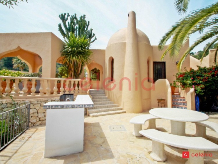 Villa with private pool in Moraira for holiday rental. This villa is an attractively furnished and decorated villa, the construction is in Arabic style, set in private grounds in a quiet residential area on a hillside approx. 3 km from the beach of the charming coast town Moraira. This town has become a major hotspot for anyone looking for an adorable sun filled holiday experience. There are panoramic views of the resort and sea, whilst the patio garden with kidney-shaped private swimming pool, sun patio and BBQ offer lots of space for relaxing.